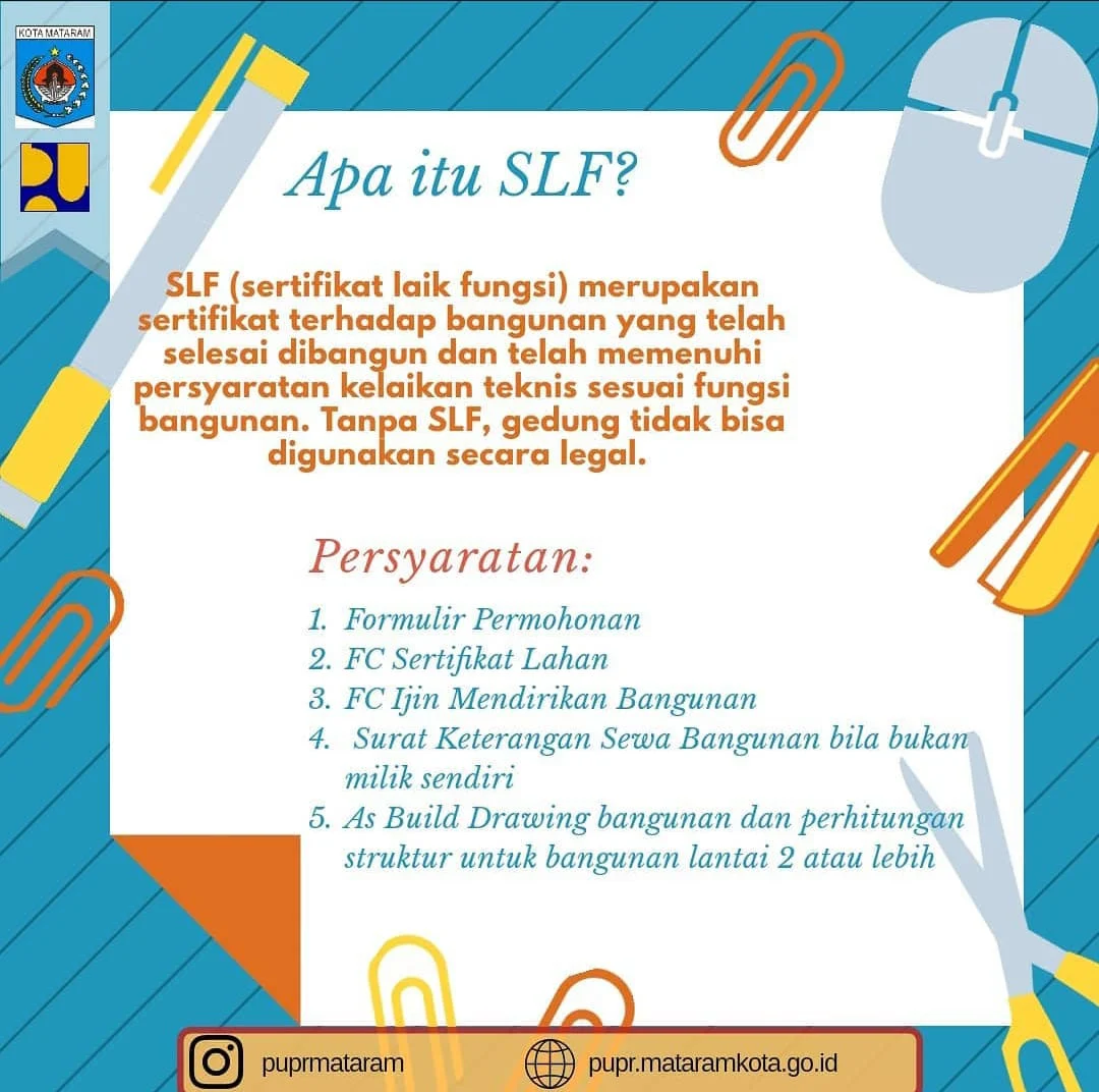 Layanan Sertifikat Laik Fungsi (SLF) yang disediakan oleh Dinas Pekerjaan Umum dan Penataan Ruang (PUPR) Kota Mataram adalah salah satu instrumen vital dalam menjamin keselamatan dan keberlanjutan bangunan gedung. Tujuan utama dari SLF adalah untuk memastikan bahwa setiap bangunan telah memenuhi standar teknis dan administratif yang ditetapkan, sehingga aman untuk dihuni dan digunakan sesuai dengan fungsinya. SLF ini merupakan dokumen legal yang wajib dimiliki, terutama bagi bangunan komersial, publik, dan bangunan dengan jumlah lantai lebih dari dua, dan fungsinya bukan sebagai tempat tinggal tunggal.
