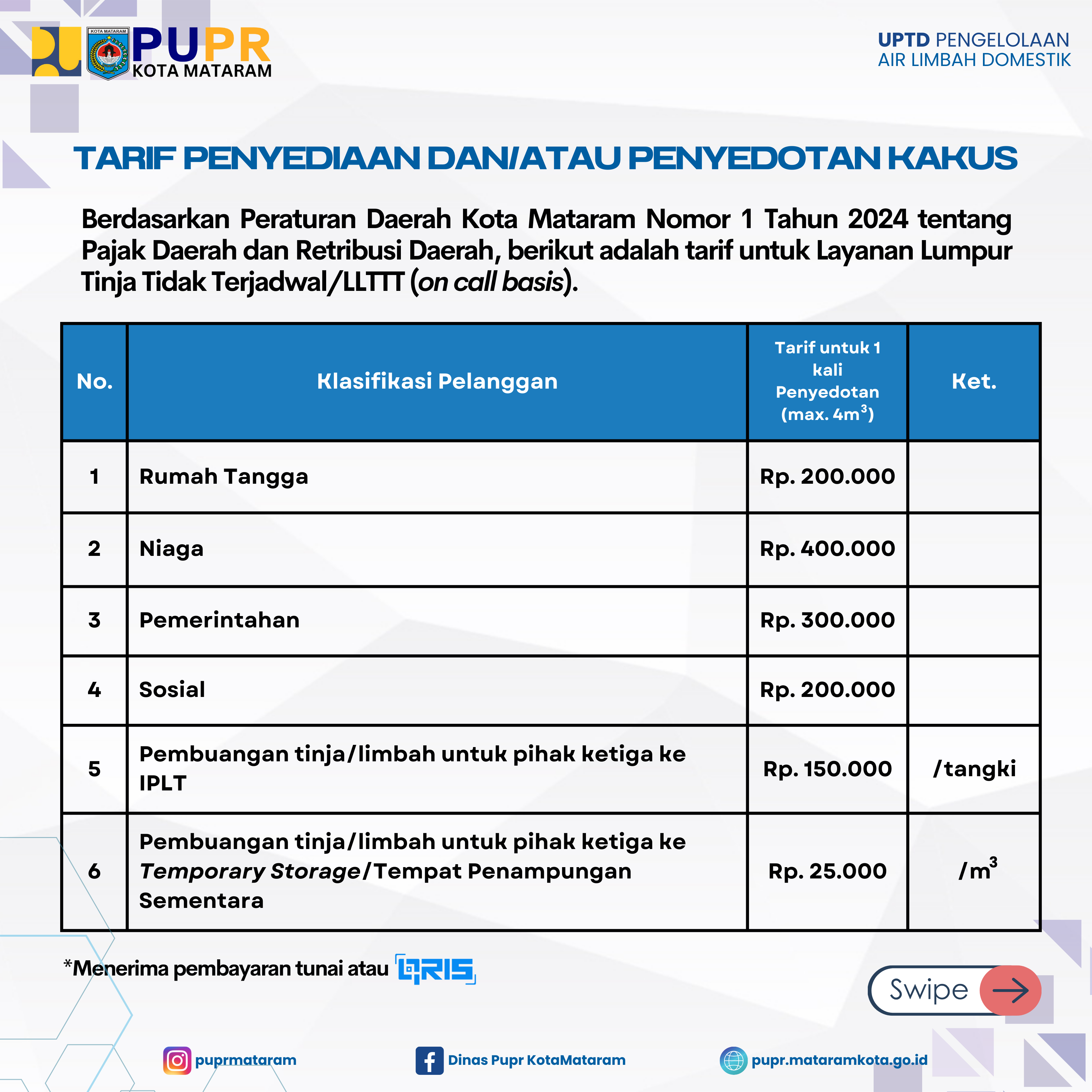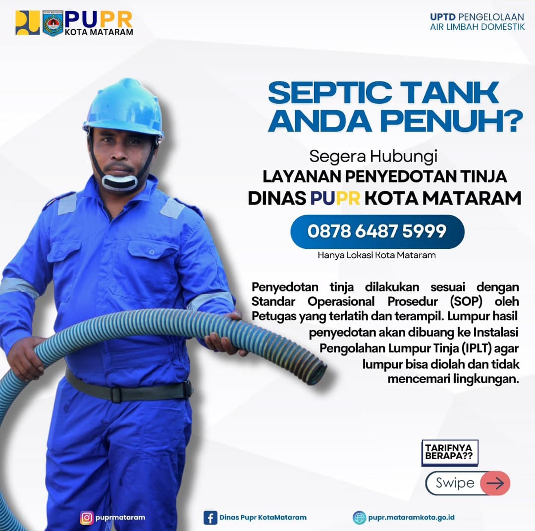 layanan Penyedotan Tinja merupakan layanan yang diberikan oleh Dinas Pekerjaan Umum dan Penataan Ruang Kota Mataram memiliki peran vital dalam menjaga kelestarian lingkungan melalui layanan penyedotan tinja. Program ini bertujuan utama untuk memastikan sanitasi aman dengan mencegah limbah tinja mencemari sumber air tanah dan permukaan, yang merupakan salah satu fokus utama dalam penataan ruang perkotaan. Dengan penyedotan berkala, Dinas PUPR memastikan tangki septik di rumah tangga dan fasilitas umum tidak meluap, sehingga mengurangi risiko penyebaran penyakit menular seperti diare dan kolera. Lebih dari sekadar layanan teknis, program ini juga merupakan bagian dari strategi pemerintah untuk mewujudkan lingkungan yang sehat, bersih, dan berkelanjutan, sekaligus meningkatkan kesadaran masyarakat akan pentingnya pengelolaan limbah domestik yang baik. Dengan demikian, penyedotan tinja oleh Dinas PUPR tidak hanya melindungi kesehatan masyarakat, tetapi juga mendukung tercapainya kualitas lingkungan hidup yang lebih baik secara keseluruhan.